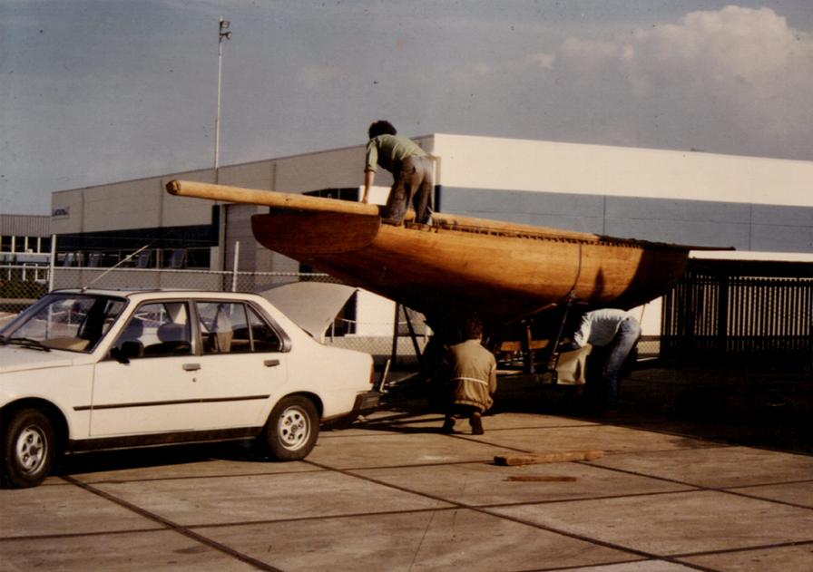 Wij vonden dan ook een andere locatie nabij Baarn in een loods waar een draak en een 22 m2 scherenkruiser lag. In goed gezelschap dus. Trailer geleend, Walta erop, Renault 18 ervoor, gevolg met restanten erachter en de verhuizing was in een zaterdag gepiept. |
